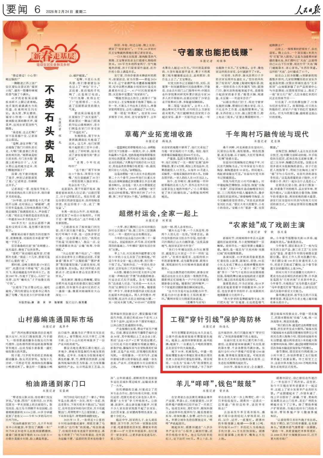 2月24日,人民日报第06版刊发文章《工程“穿针引线”保护海防林(新春走基层·建设宜居宜业和美乡村)》,版面图及全文如下: