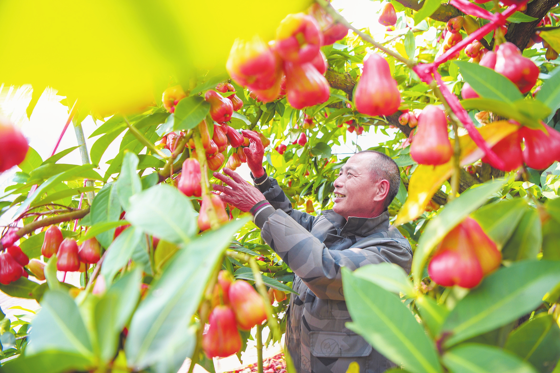 陈长雄种植莲雾已有10多年,8亩果园内种有中国红、黑金刚两个品种。“莲雾一年能多次结果,这次采摘结束后催花,3个月就能再次挂果。”陈长雄介绍,如今乡村采摘游越来越火爆,他将自家莲雾全部用于采摘体验,采摘价格较市场价更低,每周都有不少游客慕名而来,“镇里帮我宣传推广,还经常组织研学活动来采摘,我的采摘园越来越红火了。”